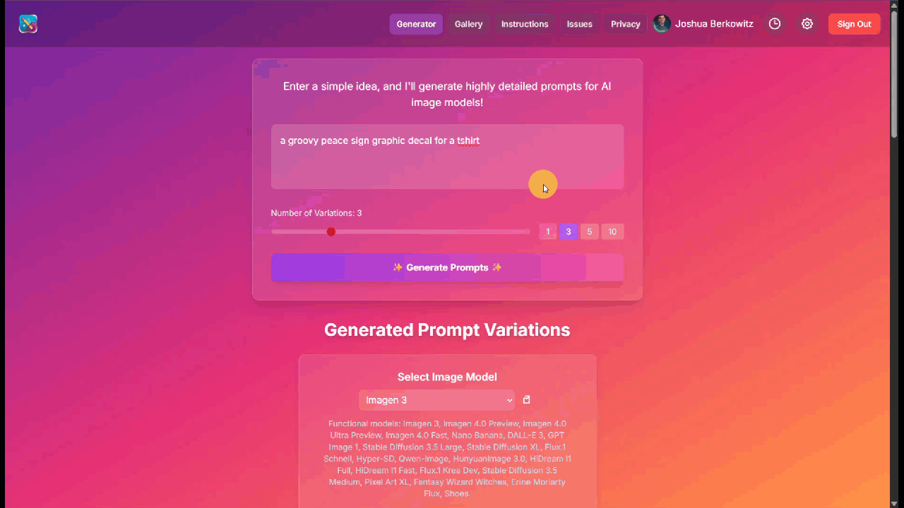 Quickly and easily create amazing image prompts for social media, video generation, content marketing, graphic apparel and more!