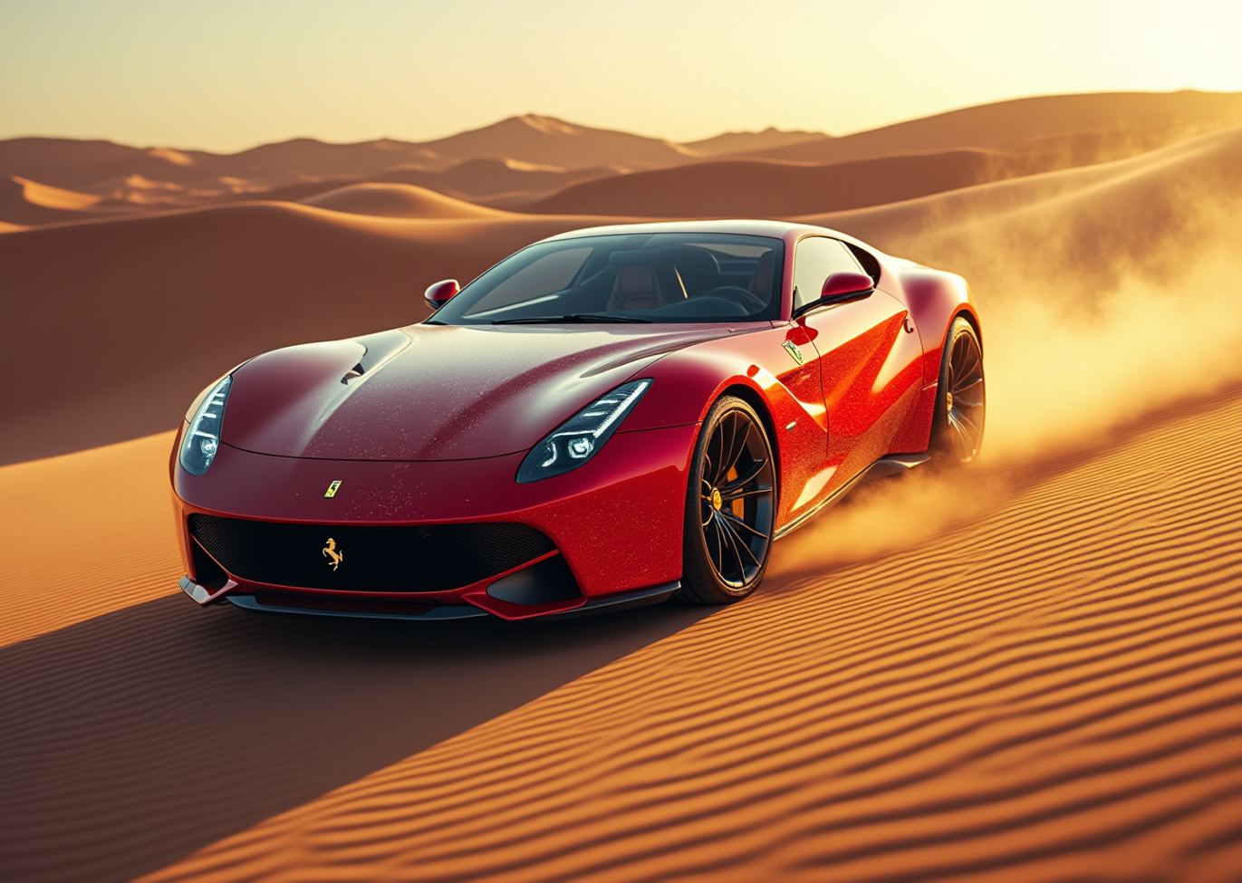 A vibrant, [metallic red Ferrari 296 GTB (futuristic interpretation), with integrated holographic display elements shimmering on its body], hovering slightly above a vast, golden sand dune in a futuristic desert landscape. The setting sun bathes the scene in warm, golden hour light, creating soft, long shadows and a sense of endless expanse. A subtle, shimmering heat haze rises from the ground. Shot with a telephoto lens from a low angle, emphasizing the [car's sleek lines] against the vast backdrop. Shallow depth of field isolates the car, blurring the distant dunes into a soft, ethereal background. The iconic [Ferrari emblem] is prominently displayed on the front. The vibe is luxurious, awe-inspiring, and almost otherworldly, blending speed with mystique.