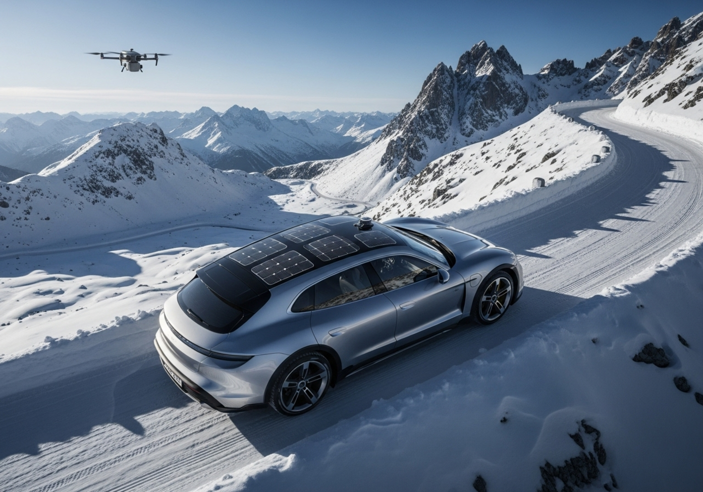 A [glossy, metallic silver Porsche Taycan Cross Turismo (futuristic version), with integrated solar panel detailing on its roof], ascending a winding, snow-covered mountain road. The car is surrounded by jagged, snow-capped peaks under a clear, bright early morning sun, casting crisp, long shadows. A small, advanced drone is subtly visible in the top corner of the frame, hinting at autonomous capabilities. Captured with a drone's overhead view, showcasing the car's journey through the pristine landscape. The scene is illuminated by natural daylight with a cool, crisp tone. The overall vibe is one of exploration, sustainability, and effortless performance in challenging environments.