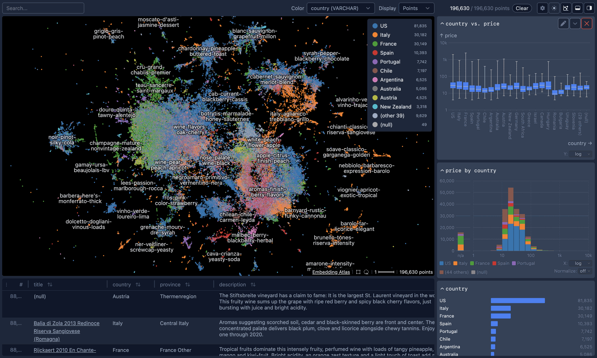 Embedding Atlas offers a combination of thoughtful design and technical innovation. The tool accepts standard data formats like Parquet file. It scales to millions of points through efficient rendering algorithms and data structures.
