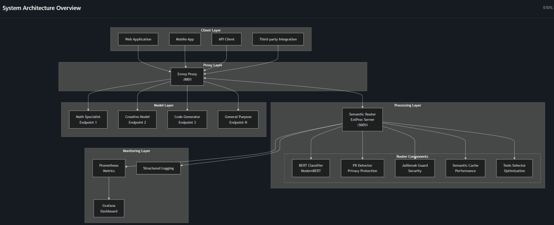 The Semantic Router is an API gateway for LLMs that adds intent classification, safety screening, and cache-aware dispatch. It sits between your clients and providers, choosing a backend model per request and attaching routing metadata for analytics and auditing. It aims to reduce cost variance, improve task fit, and make policy enforcement explicit.