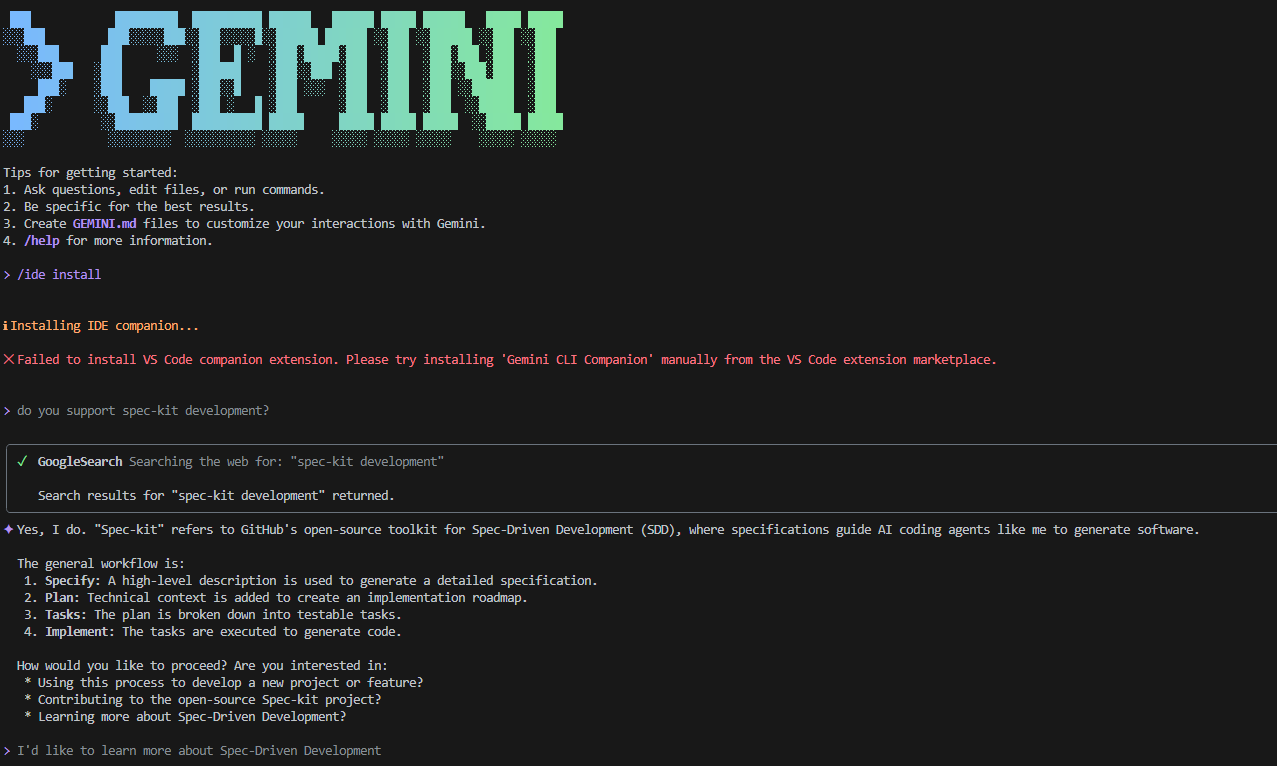 Prompting your AI client whether on the chat interface or terminal can help you learn more about spec-kit usage in your particular use case or client. Shown above the Gemini CLI is up to date with spec-kit processes allowing it to guide you through project setup and configuration.