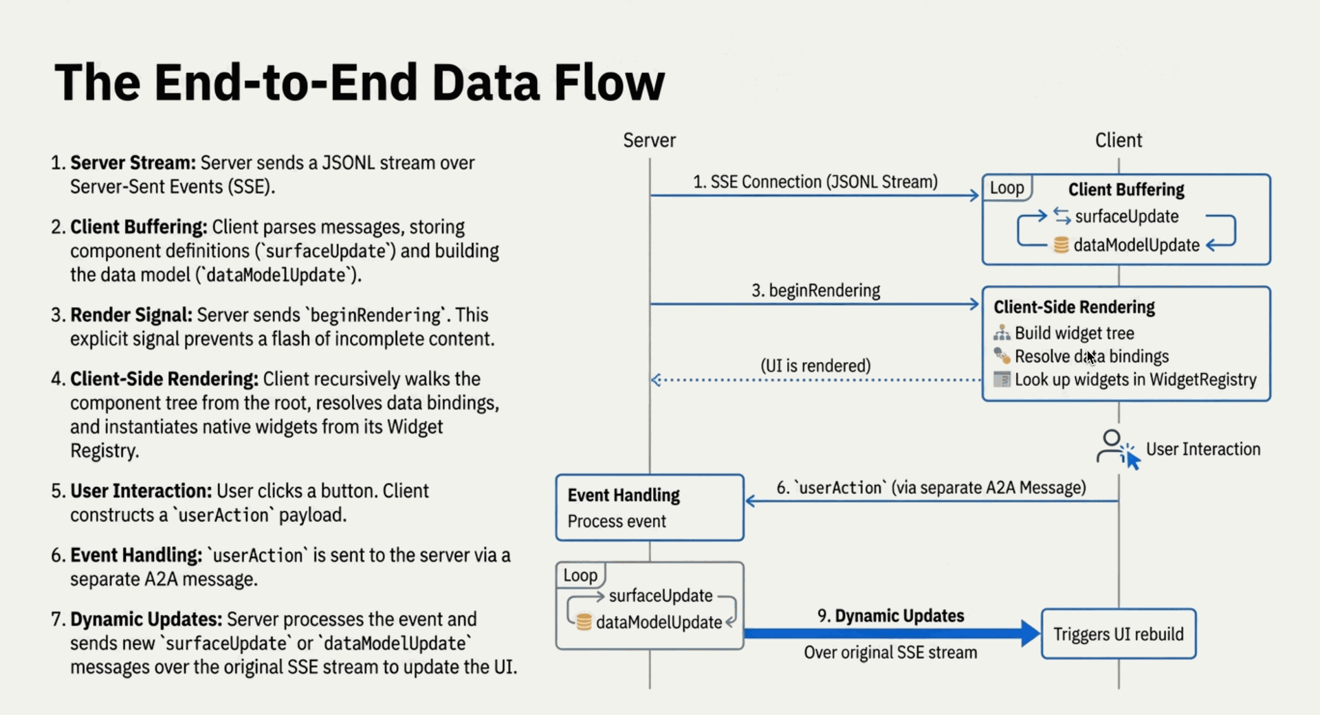 As agents increasingly collaborate across organizations and platforms, maintaining secure and consistent UIs is a challenge. Sending raw HTML or JavaScript can introduce security risks and styling inconsistencies. A2UI tackles this with a declarative JSON-based UI specification. Instead of sharing code, agents transmit structured data, which client applications render using their trusted component libraries. The result is enhanced security and native, unified styling regardless of platform.