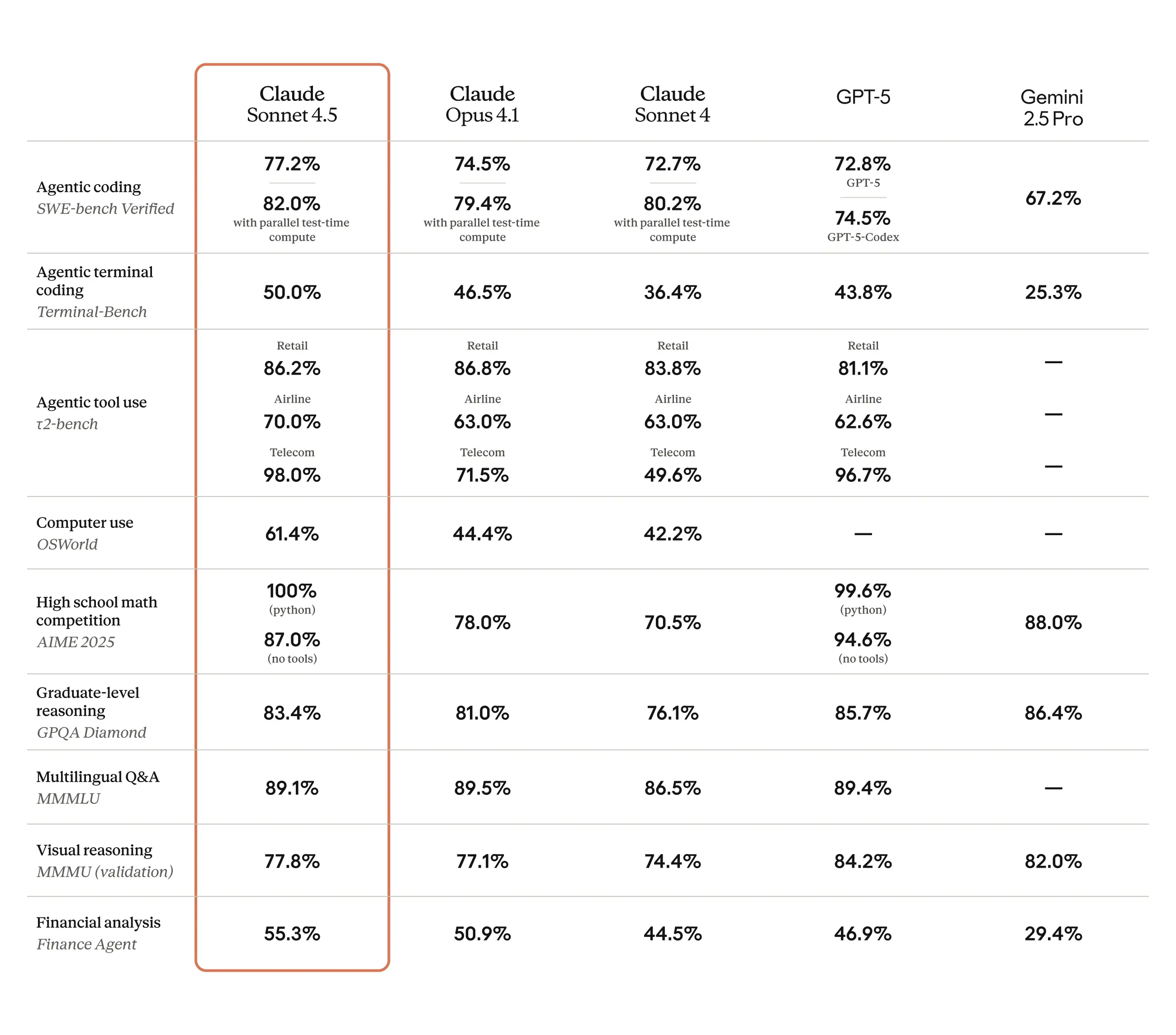 Claude Sonnet 4.5 distinguishes itself with state-of-the-art coding performance and sustained focus on extended tasks. On the SWE-bench Verified benchmark, it leads in software engineering assignments, maintaining accuracy and context for over thirty hours. In automation, it sets a new high on the OSWorld benchmark, jumping from 42.2% to 61.4% task completion compared to its predecessor.