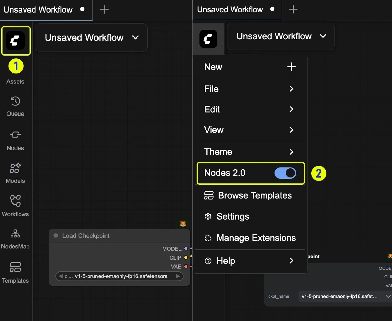 - If you prefer the classic view, just click the ComfyUI logo, access the menu, and toggle off the “Nodes 2.0” option.