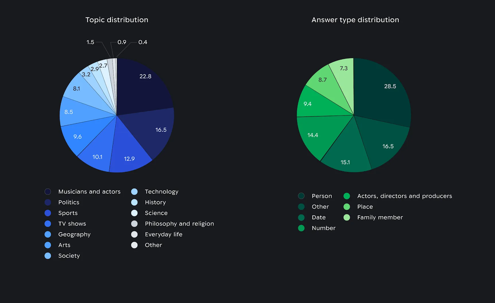Distribution of context domain (left) and distribution of the answer type (right) as a percent of the total set of questions in the Parametric benchmark.