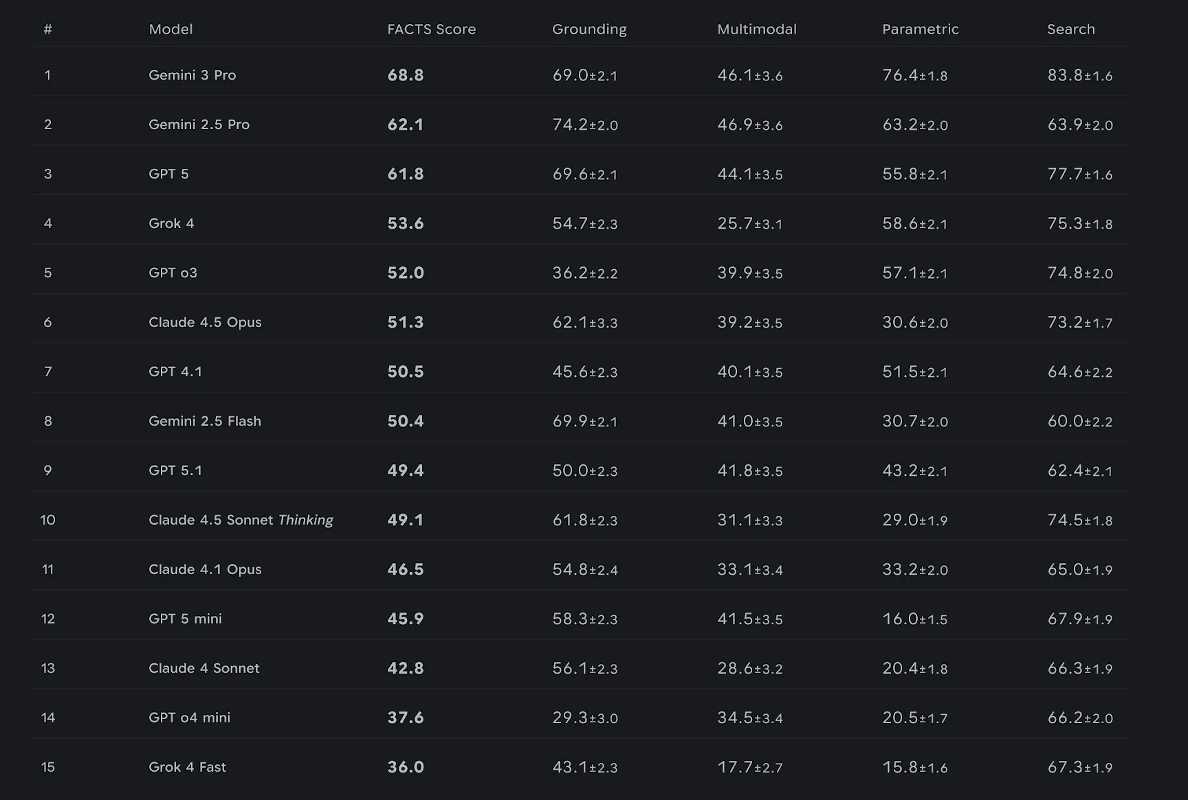 Fifteen top LLMs were evaluated on the FACTS Suite. Gemini 3 Pro led the pack, posting a FACTS Score of 68.8%. Its upgrades over previous versions were notable, achieving a 55% drop in Search error rates and a 35% reduction in Parametric errors.