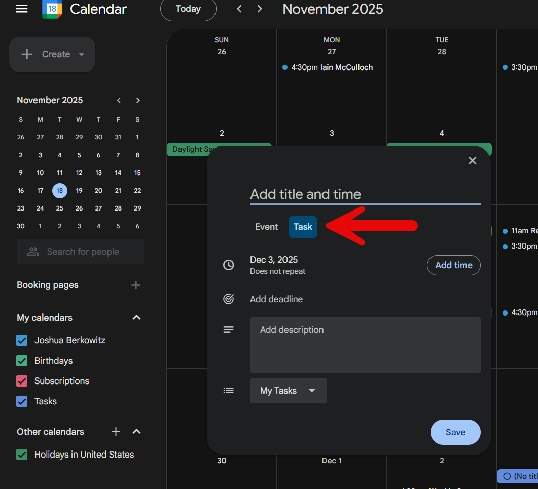 - Click on an empty time slot in Google Calendar and select “Task.”