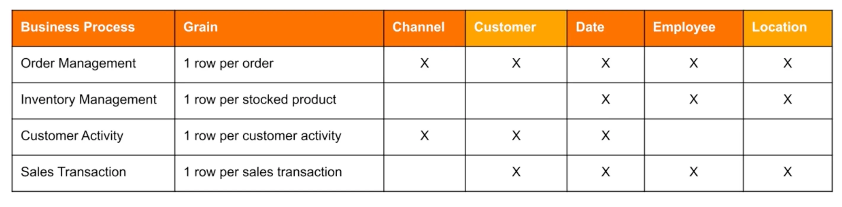 The bus matrix is a practical planning tool that maps business processes (future fact tables) against the dimensions they require. Built through collaboration with stakeholders, it keeps both business and technical teams aligned and ensures your models cover current and future requirements.