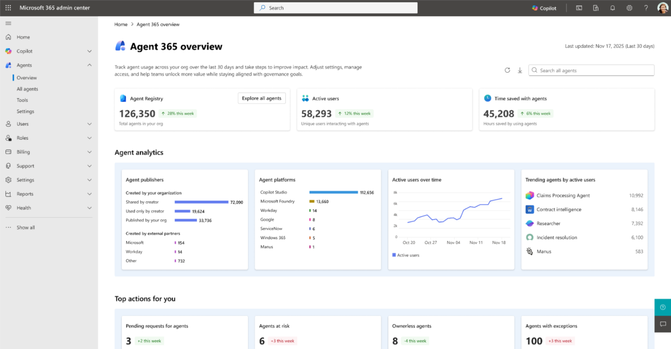 The debut of Microsoft Agent 365 gives admins a unified control plane for managing AI agents at scale. The Agent Overview dashboard provides visibility into all agents, surfacing metrics such as active users, hours saved, and outstanding requests. Potentially risky agents are flagged, guiding proactive governance.
