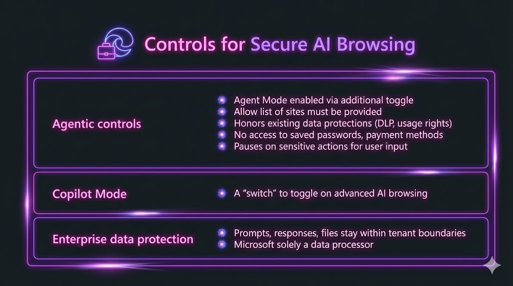 Crucially, Copilot Mode respects the "secure by design" philosophy. It honors all existing Data Loss Prevention (DLP) policies, ensures commercial data protection (meaning Microsoft doesn't train on your data), and requires explicit activation, giving organizations full control over the pace of AI adoption.