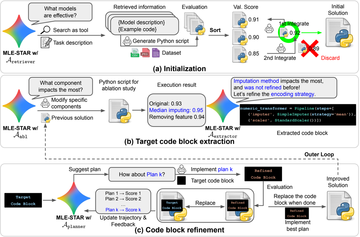Overview. (a) MLE-STAR begins by using web search to find and incorporate task-specific models into an initial solution. (b) For each refinement step, it conducts an ablation study to pinpoint the code block with the most significant impact on performance. (c) The identified code block then undergoes iterative refinement based on LLM-suggested plans, which explore various strategies using feedback from prior experiments. This process of selecting and refining target code blocks repeats, where the improved solution from (c) becomes the starting point for the next refinement step in (b). Credit: Google