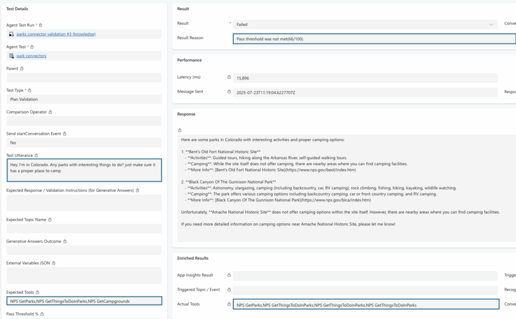Plan Validation addresses this by checking if an agent used the expected tools in its reasoning process. Developers define trigger phrases, specify required tools, and set acceptable deviation thresholds. The validation process is deterministic since it evaluates whether the agent’s actions align with the plan without relying on subjective AI scoring.