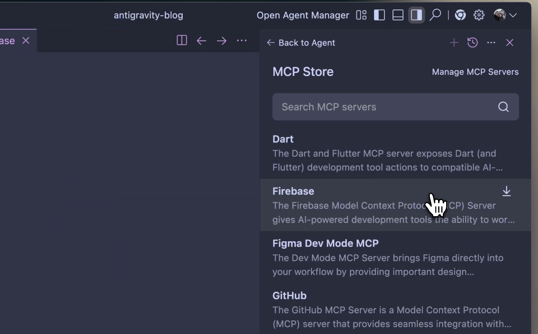 Integrating Firebase MCP is refreshingly simple. By accessing the Agent window in Antigravity and selecting “MCP servers,” you can choose and install the Firebase MCP server from the available list. This setup empowers the Antigravity agent to access Firebase’s robust suite of development tools directly inside your IDE, eliminating the need for tedious configuration steps.