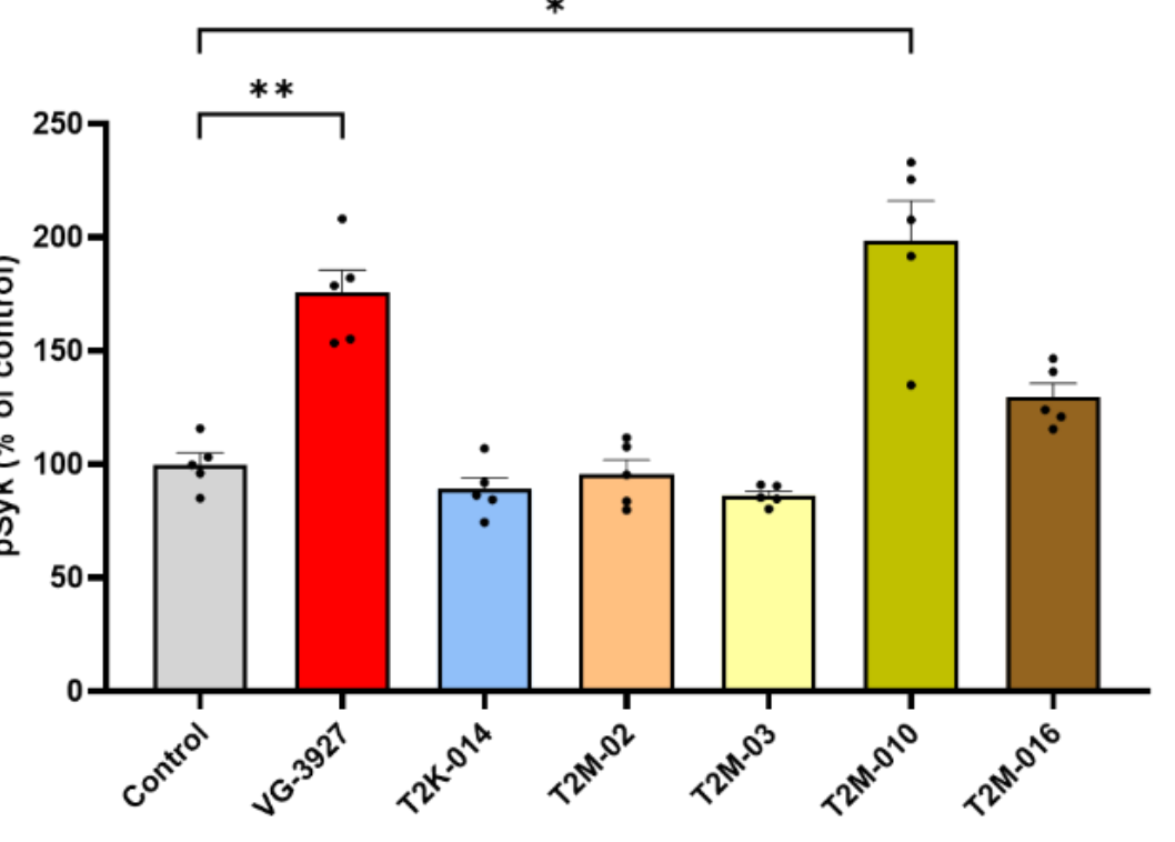 Figure 4. Relative changes in SYK phosphorylation in response to TREM2 agonists, measured by AlphaLISA. Histogram illustrating the relative levels of phosphorylated SYK (Tyr525/526) in HEK–hTREM2/DAP12 cells under control conditions and following treatment with candidate TREM2 agonists: T2K-014, T2M-02, T2M-03, T2M-010 and T2M-016 at 25 µM for 1 hour. Additionally, cells were treated with the commercial TREM2 agonist VG3927 (25 µM, 1 h) as a reference compound. Phospho-SYK levels were quantified using the AlphaLISA SureFire Ultra assay and are expressed as a percentage relative to the control condition (vehicletreated cells). Data represent the mean ± SEM from five independent biological replicates. Statistical significance was assessed using Brown-Forsythe and Welch Anova test followed by Dunnett ’s multiple comparison test (*p <0.05, **p < 0.01). Credit: Gabr et al.