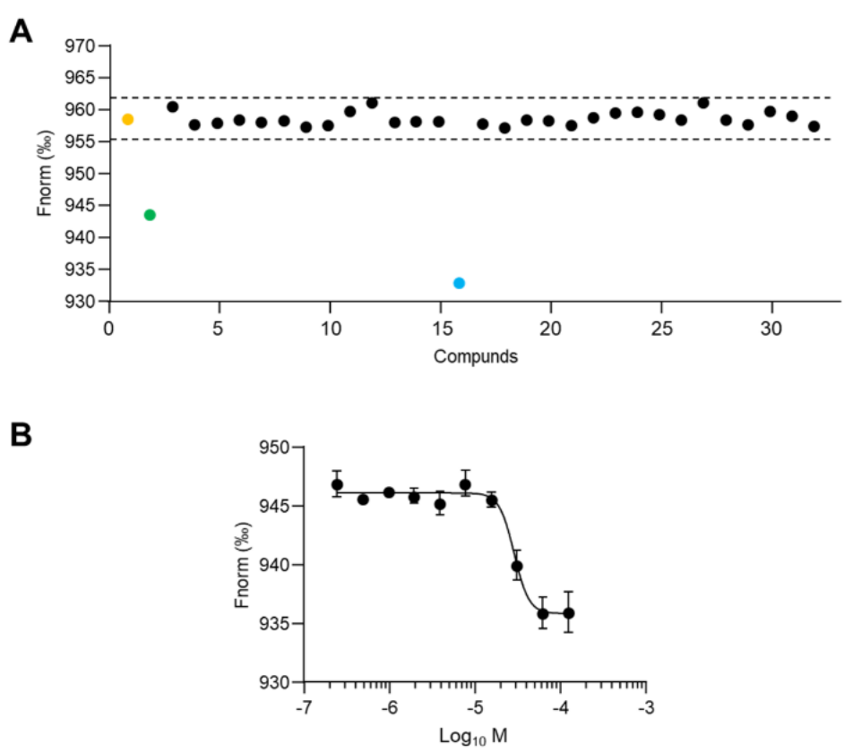 Figure 2. Characterization of selected virtual screening hits for TREM2 binding. A) Biophysical validation of 30 computationally selected compounds using TRIC analysis. Compounds were tested at 100 μM against recombinant TREM2 protein (10 nM). Yellow dot: baseline control (TREM2 alone); green dot: reference compound PC-192. Dashed lines denote hit selection criteria based on 5-fold standard deviation above background signal. Blue dot represents the confirmed binding compound (T2K-014); black dots indicate non-binding compounds. B) Dose-response curve using MST for the binding of T2K-014 to TREM2. Data represent mean ± SEM (n = 3). Credit: Gabr et al.