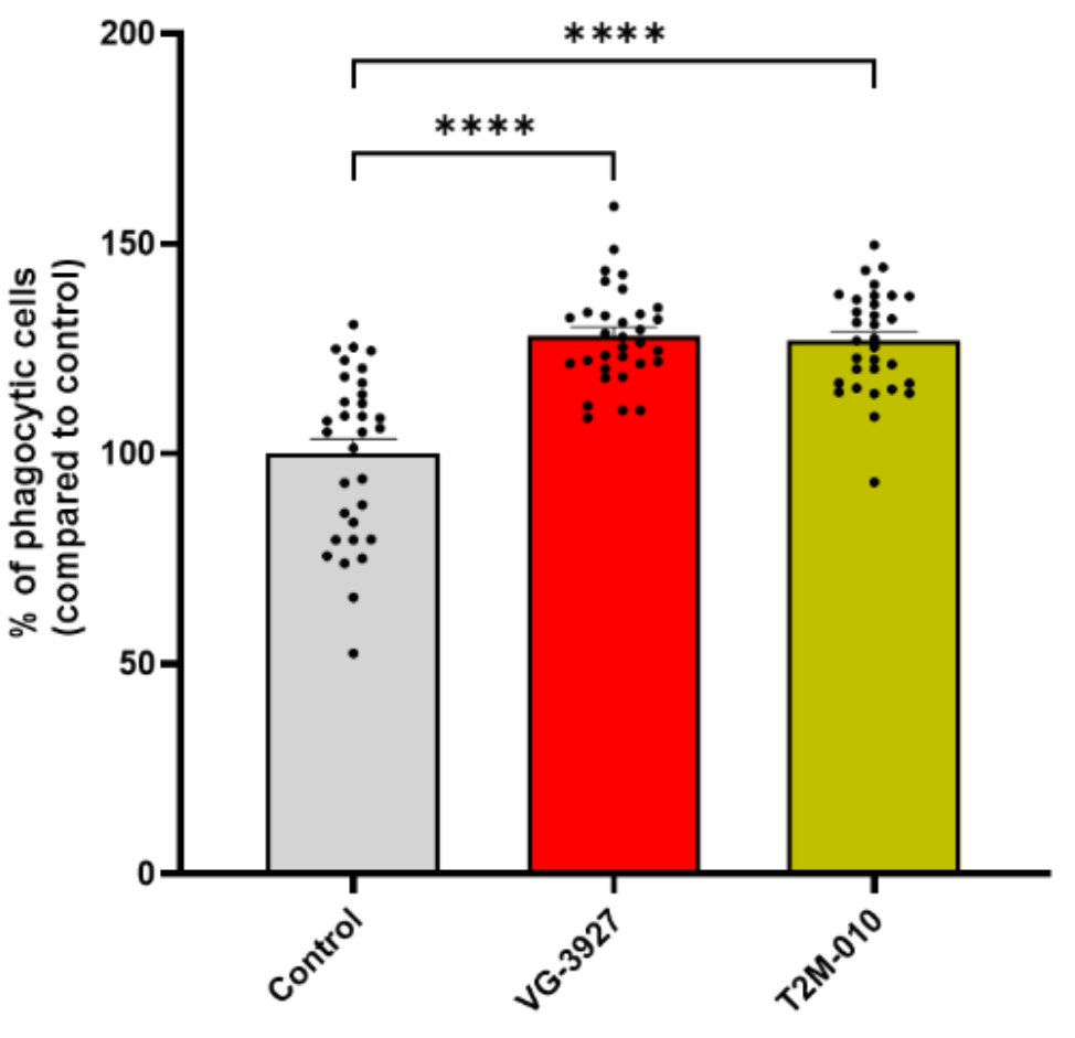 Microglial Effector Function: In BV2 microglia, T2M-010 significantly enhanced phagocytic uptake of fluorescent beads, again comparable to VG-3927. Figure 5 quantifies the percent of IBA1-positive microglia containing at least one internalized bead across replicates, with stringent statistics (Brown-Forsythe and Welch ANOVA with Dunnett's test; ****