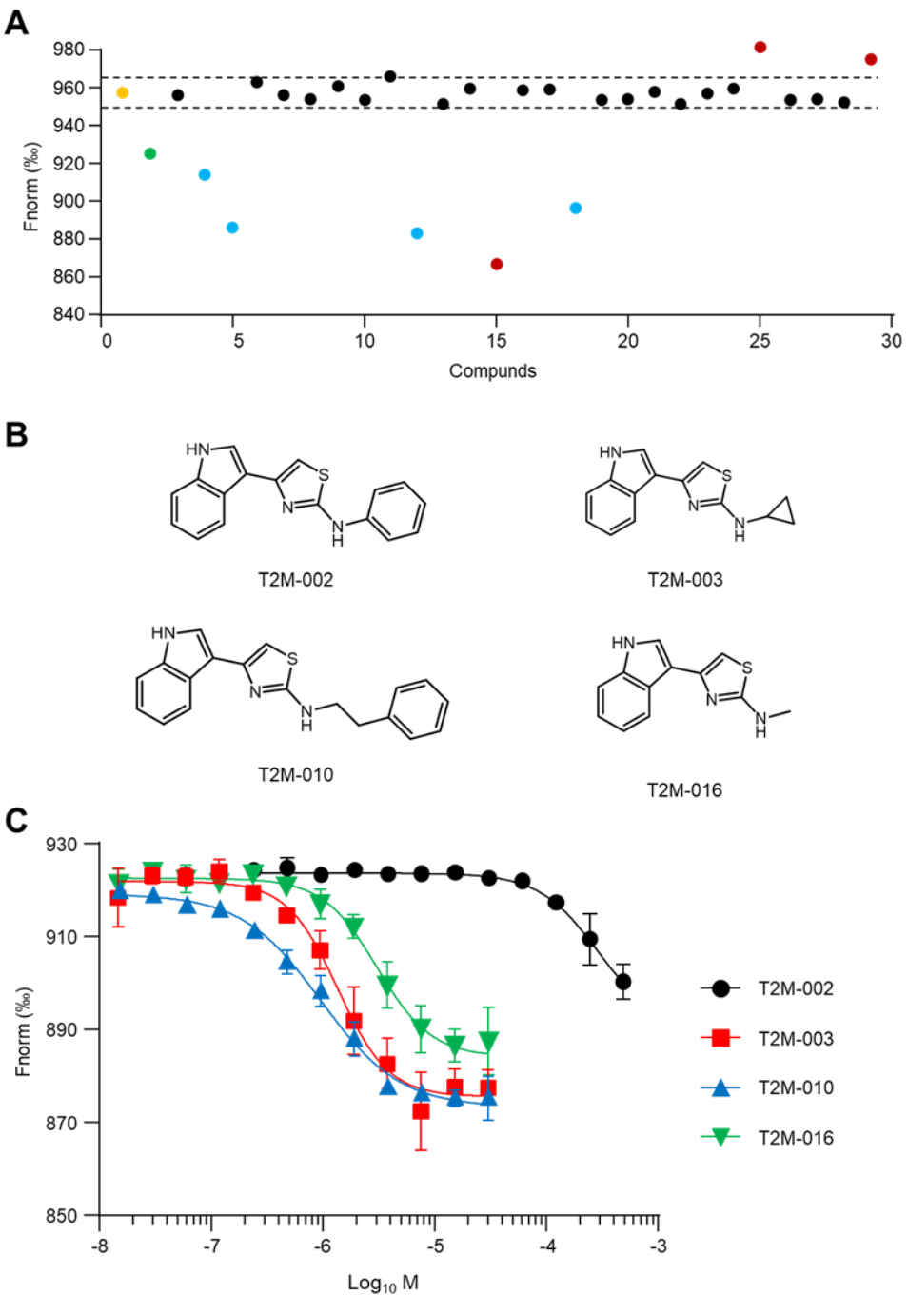 SAR and Improved Affinity: Twenty-seven analogs probed R1 (indole region) and R2 (pyridine region) substitutions. Four derivatives exceeded binding thresholds in TRIC and advanced to MST: T2M-002 (Kd 50.84 ± 3.74 μM), T2M-003 (1.35 ± 0.16 μM), T2M-016 (2.44 ± 0.30 μM), and T2M-010 (0.83 ± 0.10 μM).