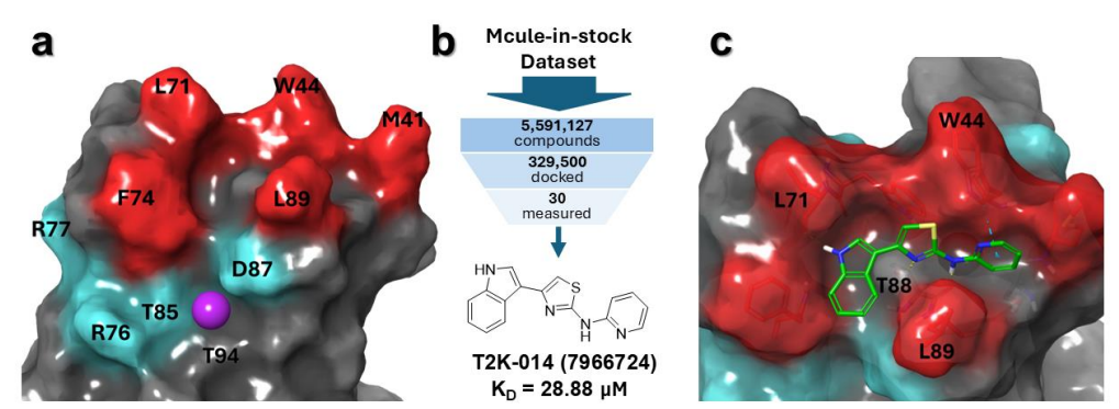 Figure 1 depicts the binding site partitions, the screening workflow, and the predicted T2K-014 pose; together they contextualize how the authors bridged in silico triage with wet-lab traction.