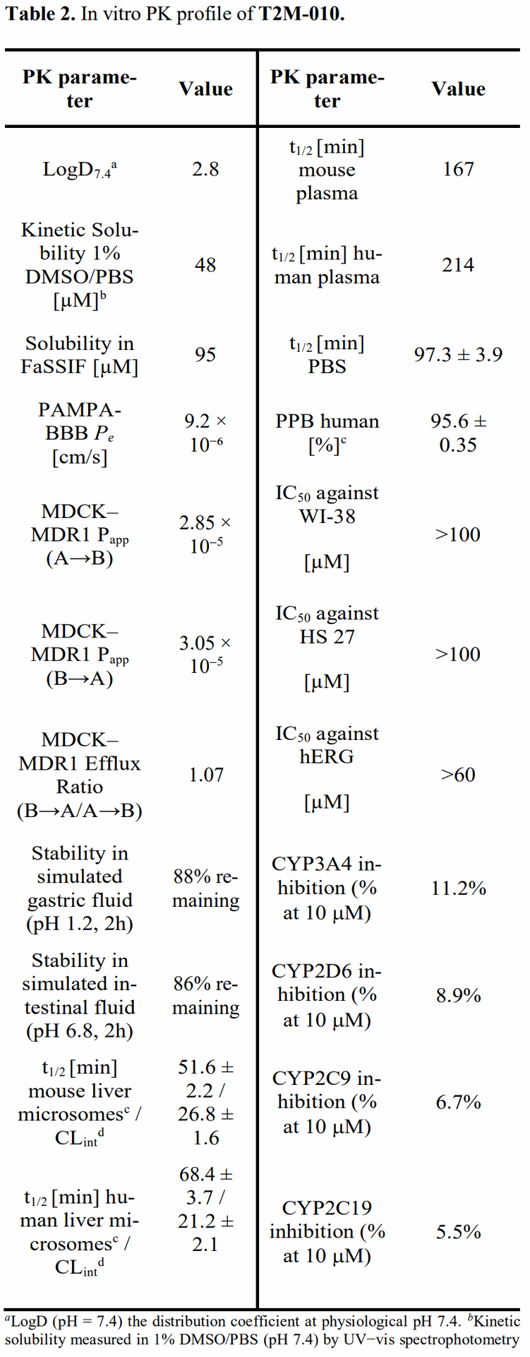 In Vitro ADME/PK and Safety: T2M-010 displayed properties aligned with CNS exposure and developability. Highlights include moderate logD7.4 (2.8), good kinetic and biorelevant solubility (PBS and FaSSIF), high passive permeability in PAMPA-BBB (Pe ~ 9.2 × 10^−6 cm/s), robust MDCK–MDR1 transport with low efflux (ER ~ 1.07), long plasma half-life (mouse 167 min; human 214 min), moderate microsomal stability with acceptable projected clearance, high plasma protein binding (PPB ~ 96%), and clean counterscreens in human fibroblasts (IC50 > 100 μM) and hERG (> 60 μM at tested conditions). Table 2 in the paper collates these metrics and their assay conditions.