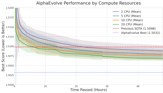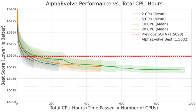 Using 20 parallel CPU threads rather than 2 accelerated discovery significantly but approximately doubled total LLM queries, illustrating the cost-speed tension in evolutionary search. For difference bases, kissing numbers, and sphere packing problems, AlphaEvolve consistently approached or matched known optimal solutions, often discovering elegant programmatic descriptions that human mathematicians could study and extend.