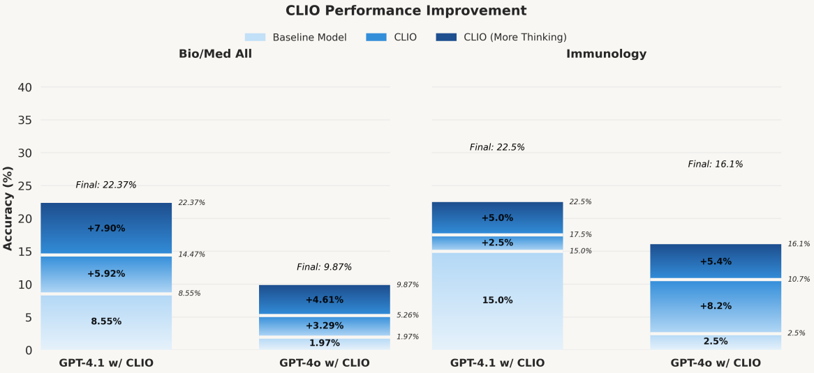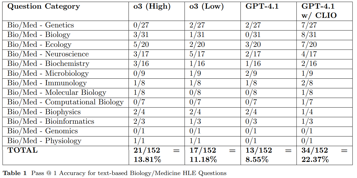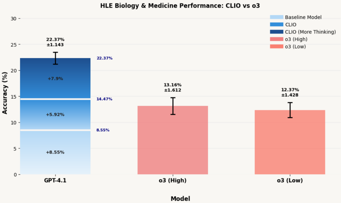 - Measured gains: On 152 HLE biology/medicine questions without tools, GPT-4.1 with CLIO achieved 22.37% Pass@1, surpassing o3 high/low modes and base GPT-4.1.