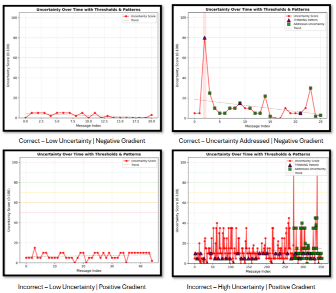 - Uncertainty as a signal: Oscillation patterns and slopes in internal uncertainty correlate with correctness; rising uncertainty or persistent oscillations flag when human intervention is prudent.