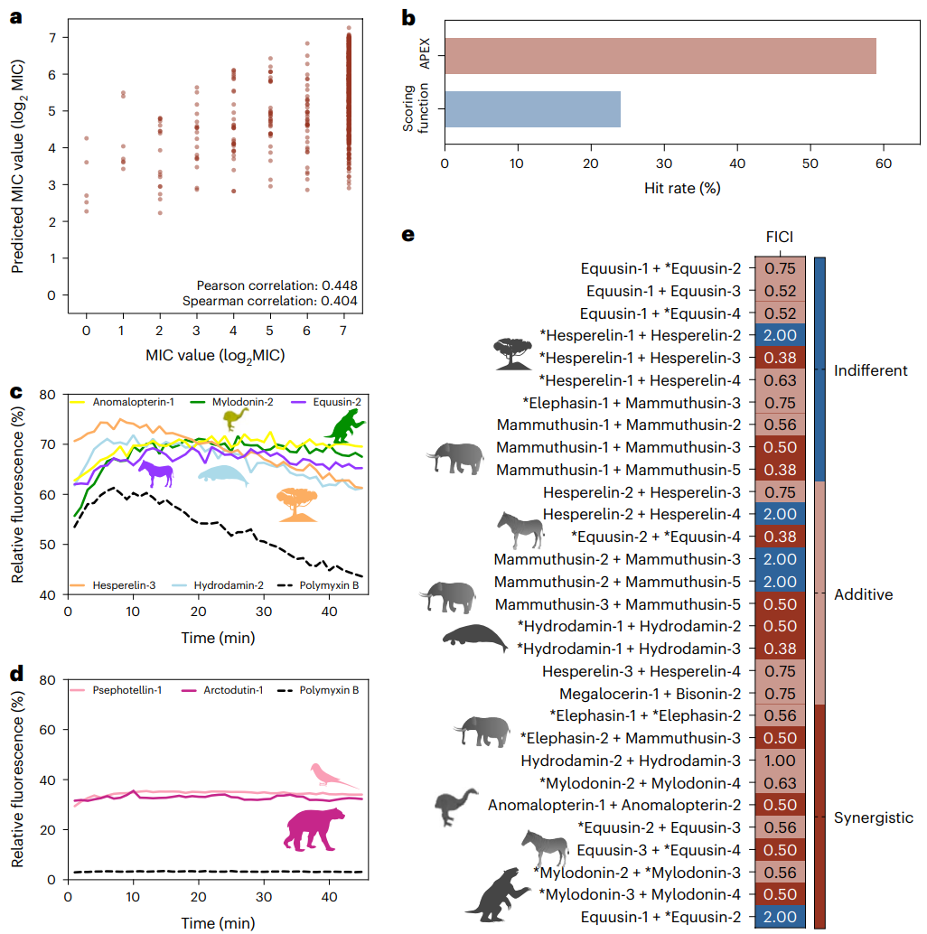 Fig. 5 | Antimicrobial activity, mechanism of action and synergy of antimicrobials from the proteomes of extinct organisms. a, Pan-bacterial Pearson and Spearman correlations of log2-transformed MICs between experimentally validated values and values predicted by APEX. b, Comparison between the hit rates of APEX and the scoring function previously described by Torres et al.16 to detect antibiotics in the modern human proteome. c, Cytoplasmic membrane depolarization by five antimicrobials from extinct organisms. The A. baumannii membrane was more strongly depolarized by the peptides than by the antibiotic polymyxin B. d, NPN permeabilization assays showing the effect of two antimicrobials from extinct organisms on the outer membrane of A. baumannii. Higher permeability was observed with the peptides than with the antibiotic polymyxin B. e, Heat map showing interactions between antimicrobials identified by APEX, expressed as the FICI. Most of the tested EP pairs from extinct organisms either synergized or had an additive effect against A. baumannii and P. aeruginosa; the latter was only tested against the peptide pair composed of equusin-1 and equusin-2 shown in the last row of the heat map. The data for the assays in c–e are the mean, and the experiments were performed in three independent replicates. AEPs in e are indicated by an asterisk (*). Credit: Wan et al.