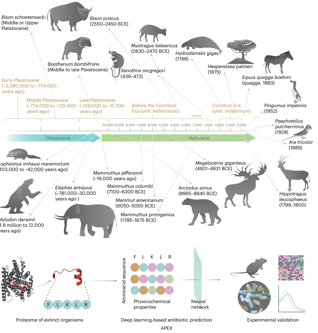 Fig. 1 | Molecular de-extinction of antibiotics from ancient proteomes using deep learning. All available proteomes of extinct organisms were mined by APEX deep learning algorithm. Amino acid sequences ranging from 8 to 50 amino acid residues within proteins from extinct organisms were inputted into multitask deep learning models that trained on both public and in-house peptide data to evaluate the potential antimicrobial activity. The highest ranked peptides based on predicted antimicrobial activities were then selected and thoroughly characterized against clinically relevant pathogens both in vitro and in animal models. The mechanism of action, physicochemical features and synergistic interactions of these peptides were also assayed. The dates report the approximate extinction date or period for the organisms studied. The protein and peptide structures shown in the figure were created with PyMOL Molecular Graphics System, version 2.1 Schrödinger, LLC. Credit: wan et al.