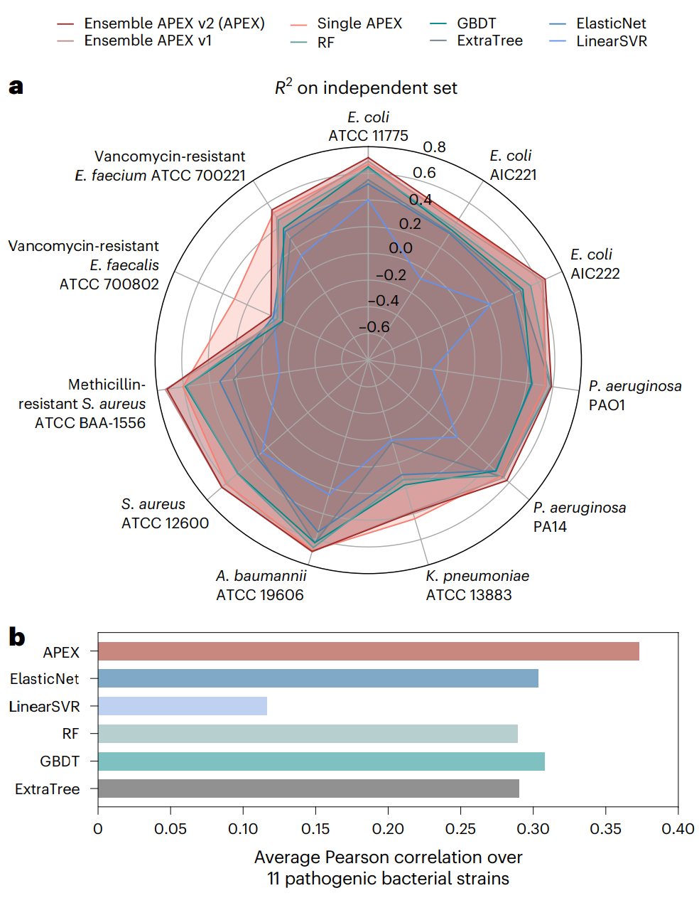 Fig. 2 | APEX prediction performance and comparison with other models. a, Radar chart showing R2 correlation in terms of species-specific antimicrobial activity prediction on an independent dataset (a held-out subset from our inhouse peptide dataset) for various ML models. The radius reflects the R2 value for each of the models. APEX variants outperformed the baseline ML methods for most of the pathogens analysed. RF, random forest; GBDT, gradient boosting decision tree; ExtraTree, extra-tree regressor; ElasticNet, elastic net; LinearSVR, linear support vector regression. b, Mean of species-wise Pearson correlation of log2-transformed MICs between values obtained experimentally and predicted by various ML models. Evaluated dataset: 69 peptides were synthesized and tested. Credit: Wan et al.