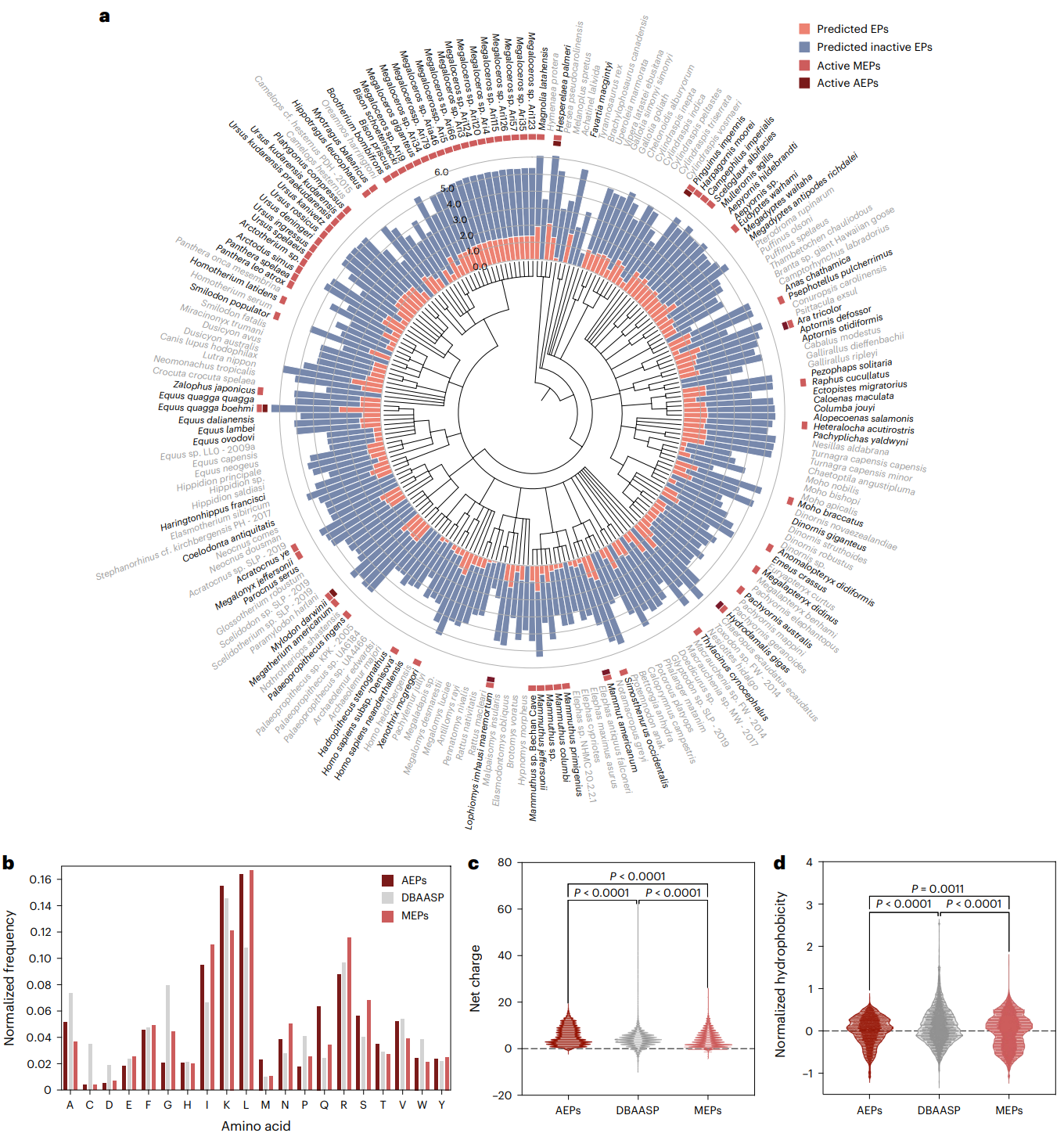 Fig. 3 | Antimicrobials identified by APEX in extinct organisms and their composition and physicochemical properties. a, Phylogenetic tree showing the extinct organisms scanned by APEX. Circular bars denote the log10- transformed average active (red) and inactive (blue) EPs discovered by APEX. A peptide was considered active when its predicted median MIC against the bacterial strains tested was ≤80 μmol l−1. The values were normalized by the number of proteins per organism scanned. The organisms whose EPs were selected for validation are highlighted in bold type. Extinct organisms that presented active EPs validated experimentally are indicated by a light red square and, within that group, those organisms encoding extinct sequences absent in extant organisms are highlighted with a dark red square. b, Amino acid frequency in AEPs and MEPs compared with known AMPs from the DBAASP database. AEPs present a higher frequency of the basic residue K, the aliphatic residue V, and uncharged polar residues (M, Q and T) than MEPs. c,d, Distribution of two physicochemical properties for peptides with predicted antimicrobial activity (AEPs and MEPs) and AMPs from DBAASP: net charge (c) and normalized hydrophobicity (d). Net charge directly influences the initial electrostatic interactions between the peptide and negatively charged bacterial membranes, and hydrophobicity directly influences the interactions of the peptide with lipids in the membrane bilayers. EPs from extinct organisms are slightly less hydrophobic and similarly have a net positive charge, compared with EPs from the modern human proteome16 or peptides from DBAASP. Statistical significance in c and d was determined using two-tailed t-tests followed by Mann–Whitney test; P values are shown in the graph. The solid line inside each box represents the mean value obtained for each group. Credit Wan et al.