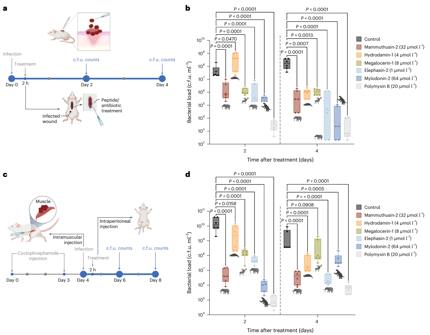 Fig. 6 | Anti-infective activity of antibiotic molecules in animal models. a, Schematic of the skin abscess mouse model used to assess the anti-infective activity of selected antimicrobials from extinct organisms (n = 6) against A. baumannii ATCC 19606. b, The molecules mammuthusin-2 (M. primigenius), hydrodamin-1 (H. gigas), megalocerin-1 (Megalocerus sp.), elephasin-2 (E. antiquus) and mylodonin-2 (M. darwinii), administered at their MIC in a single dose, inhibited the proliferation of the infection for up to 4 days after treatment compared to the untreated control group. Elephasin-2 and mylodonin-2 cleared the infection in some of the mice, with activity comparable to that of the antibiotic used as control, polymyxin B. c, Schematic of the neutropenic thigh infection mouse model in which EPs from extinct organisms were injected intraperitoneally. Anti-infective activity against A. baumannii ATCC 19606 was assessed 2 and 4 days after intraperitoneal peptide administration (n = 6). d, Two days after intraperitoneal injection, mylodonin-2 at its MIC reduced A. baumannii ATCC19606 infection as much as polymyxin B, compared to the untreated control group. Four days post treatment, mammuthusin-2 and elephasin-2 showed the same level of activity as polymyxin B. Statistical significance in b and d was determined using one-way ANOVA followed by Dunnett’s test; P values are shown in the graph. For the boxplots, the centre line represents the mean, the box limits the first and third quartiles and the whiskers (minima and maxima) 1.5 × the interquartile range. The solid line inside each box represents the mean value obtained for each group. Panels a and c were created with BioRender.com. Credit Wan et al.