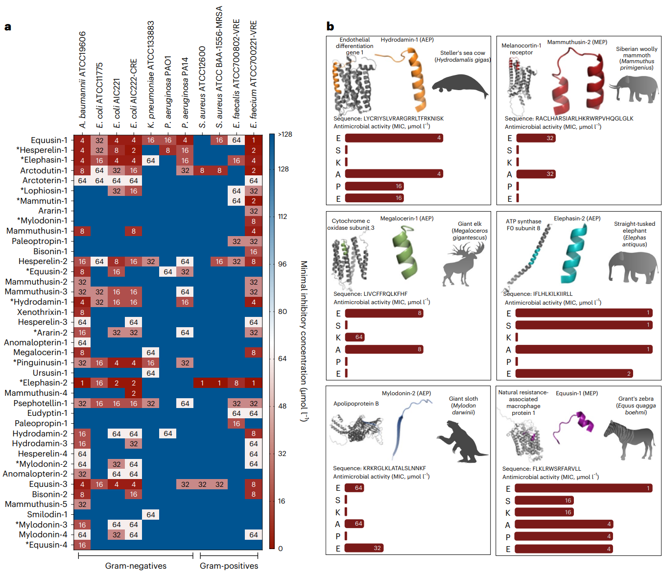 Fig. 4 | Antimicrobial activity profiles of sequences from the proteomes of extinct organisms. a, Heat map of the antimicrobial activities (μmol l−1) of the active antimicrobial agents from extinct organisms against 11 clinically relevant pathogens, including strains resistant to conventional antibiotics. Briefly, 106 bacterial cells and serially diluted EPs (0–128 μmol l−1) were incubated at 37 °C. One day post treatment, the optical density at 600 nm was measured in a microplate reader to evaluate bacterial growth in the presence of the EPs from extinct organisms. MIC values in the heat map are the arithmetic mean of the replicates in each condition. b, Examples of active AEPs and MEPs from various extinct organisms, their parent protein and their activity profile against ESKAPE pathogens (Enterococcus spp., S. aureus, K. pneumoniae, A. baumannii, P. aeruginosa, E. coli). Antimicrobial activity is expressed as the MIC (μmol l−1), and activity bars are presented as −log2 MIC14. The data for the assays in a are the mean, and the experiments were performed in three independent replicates. AEPs in a are indicated by an asterisk (*). The protein and peptide structures shown in the figure were created with PyMOL Molecular Graphics System, version 2.1 Schrödinger, LLC. Credit: Wan et al.