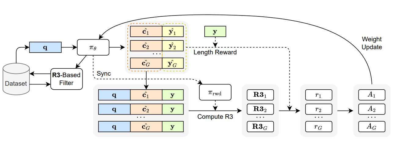 Figure 2 depicts the DRO loop. By sampling groups of chain-of-thoughts it the computes R3 using an internal policy tied to the reference model, applies a length penalty to the final outcome and updates with GRPO. The diagram also highlights dynamic, R3-based data filtering that prunes low-signal prompts during training.