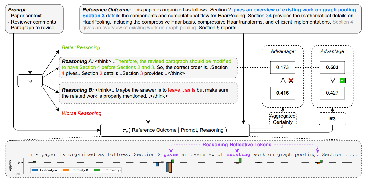 Figure 1: Illustrative example of Reasoning Reflection Reward (R3). For the paper revision task, the model is prompted to revise a paragraph based on reviewer comments (upper left). R3 computes per-token self-certainty (log-probabilities) in the reference revision (upper right) for each sampled reasoning trace, and highlights reasoning-reflective tokens using σ(certainty). In this example, Reasoning A correctly identifies that Section 4 (overview) has been moved earlier and adjusts the paragraph structure accordingly, with a minor omission of section numbers. Reasoning B gives up. While a vanilla aggregate of certainty prefers B over A due to A’s lower certainty on the token “2”, R3 successfully aligns with the desired ranking by up-weighting high-σ(certainty) tokens “gives”, “existing” and “.” that better reflect reasoning effectiveness. Credit: Xu et al.