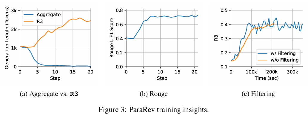 Figure 3 reports ParaRev training dynamics. Panel (a) shows chain-of-thought length: aggregate-certainty leads to rapid collapse below 100 tokens, whereas R3 steadily increases to over 2.5k, indicating healthier exploration. Panel (b) shows ROUGE-L improving despite not being rewarded, suggesting that optimizing reflective tokens yields better surface alignment as a byproduct. Panel (c) shows the on-the-fly filtering reducing wall-clock training time by about 45% while maintaining final reward and smoothing convergence.