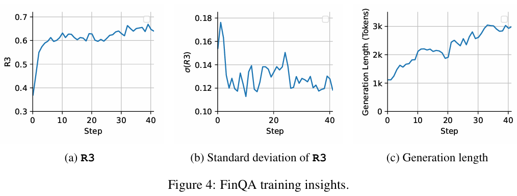 Figure 4 provides FinQA training insights. Panel (a) tracks the R3 reward rising across steps; Panel (b) shows its standard deviation shrinking, implying more stable attribution across sampled traces; Panel (c) shows continued growth in reasoning length from ~1k to >3k tokens even as reward gains begin to taper, suggesting the model continues to elaborate useful intermediate steps beyond what R3 directly incentivizes.