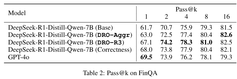 On FinQA, a math-like benchmark with verifiable answers, DRO-R3 is competitive with binary correctness at Pass@1 and exceeds it at higher Pass@k (Table 2). This suggests that token-sensitive attribution of reward can match the benefits of exact-verifier signals, and in sampling regimes with k≥2 it may better guide exploration than a single-bit correctness reward.