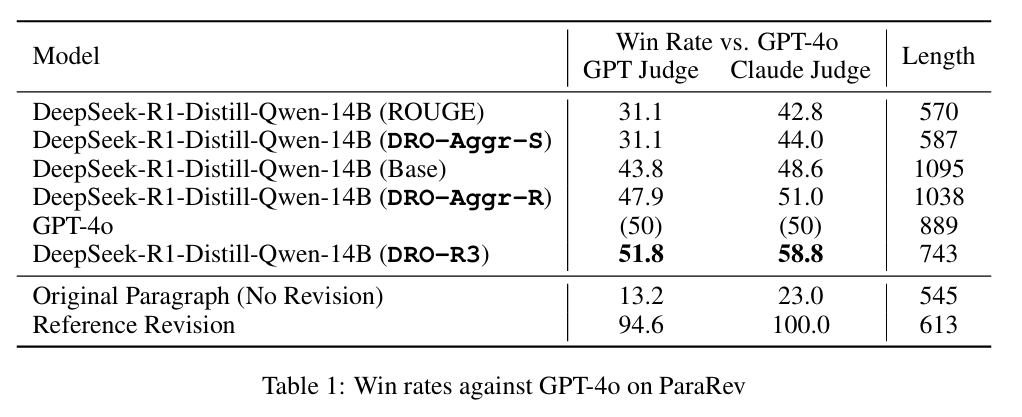 - On ParaRev, DRO-R3 beats strong baselines, including versions trained with ROUGE or simple aggregate certainty; it achieves 51.8% (GPT judge) and 58.8% (Claude judge) win rates versus GPT-4o, with more faithful edit lengths (Table 1).
