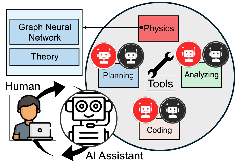 Graph neural networks excel at learning from structured data like atomic configurations. While large language models provide reasoning, planning, and natural language interaction capabilities. Specialized agents further enable task decomposition and parallel execution. Furthermore, physics-based theories ensure predictions remain grounded in fundamental principles. Together, these components create a system more powerful than any individual approach could achieve alone.