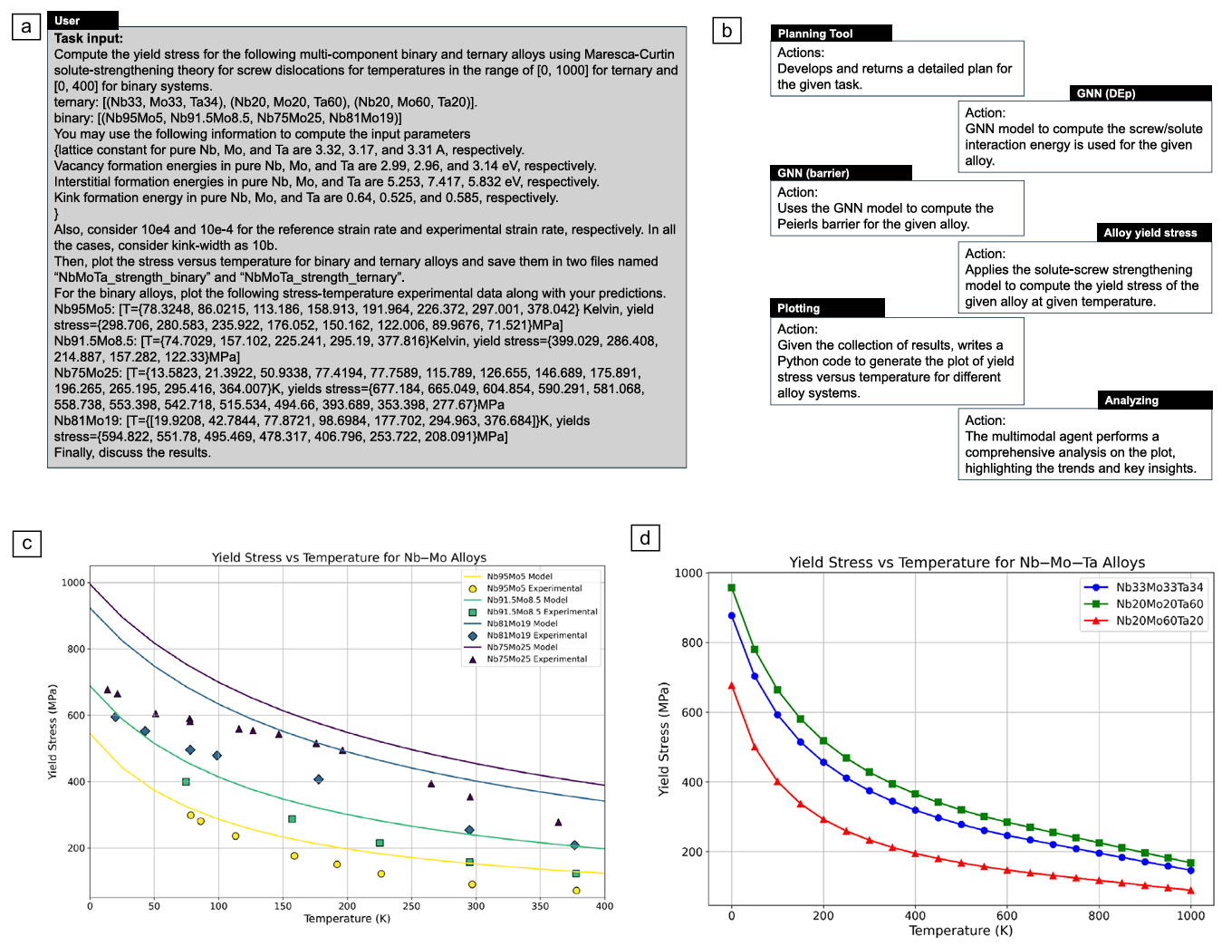 Figure 7. Overview of the multi-agent collaboration to predict the yield stress in binary and ternary alloy body-centered-cubic systems. (a) The input task involving computing the yield stress for a set of compositions. Some materials properties for the pure metals are pro vided as well as the strain rates. Moreover, the experimental data for binary alloys are provided to compare with the predictions. (b) The workflow of computations performed by our multi-agent system featuring key tasks such as planning, tool calling for material property predictions from the graph neural network (GNN) model, and finally plotting and analyzing the results. (c) Predictions of our model for the ternary alloys and (d) the predictions of our model for binary alloys along with the experimental results. Credit: Buehler et al.