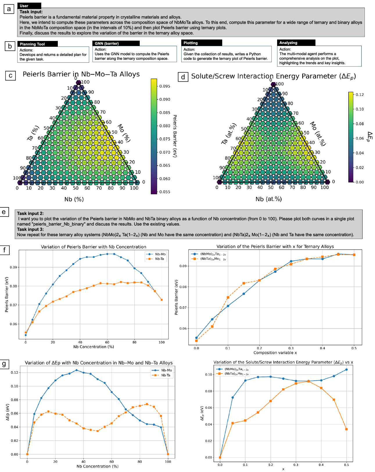 Figure 6. Overview of the multi-agent collaboration to explore the variation of the Peierls barrier and solute/screw interaction energy parameter in binary and ternary alloys. (a) User query requesting exploration of the Peierls barrier across a wide range of compositions, with a similar query repeated for the solute/screw interaction energy parameter. (b) Workflow detailing the computations and analyses performed by the multi-agent system. (c, d) Ternary plots displaying the Peierls barrier and the solute/screw interaction energy parameter, respectively, across the compositional space generated by the multi-agent system. (e) Follow-up tasks requested by the user, involving additional data plotting and analysis. (f, g) Plots illustrating the variation of the Peierls barrier and ˜Ep , respectively, with solute concentration for binary and ternary alloys, generated by the multi-agent model in response to the follow-up tasks. Credit: Buehler et al.
