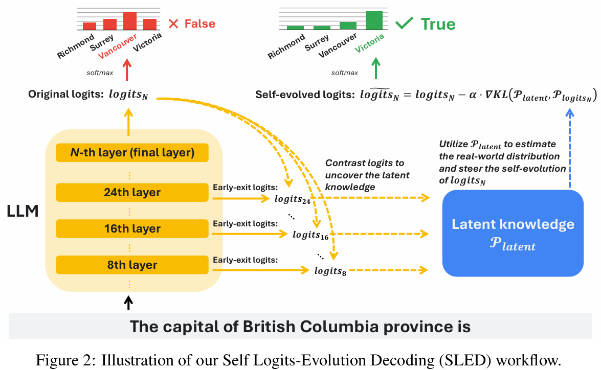 SLED starts from a simple idea that final-layer logits (the raw, unnormalized scores output by a LLM before applying the softmax function to produce probabilities) determine the next token distribution, but earlier layers often encode useful latent knowledge about what is true.