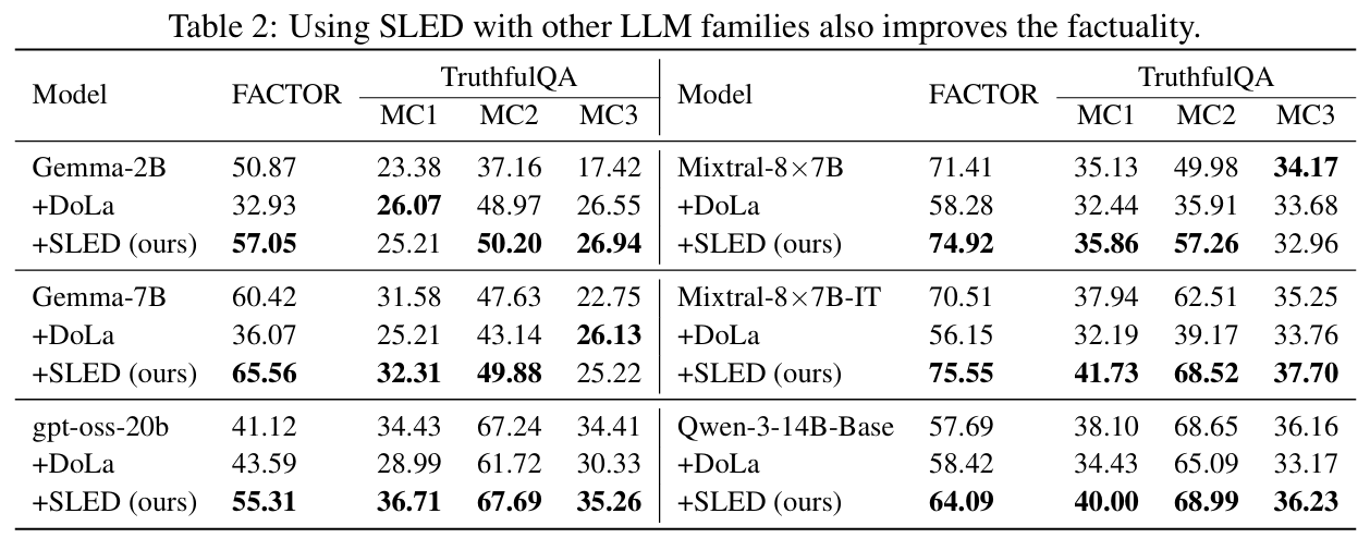 Unlike retrieval-augmented methods that query external knowledge bases or techniques that require fine-tuning, SLED runs as a drop-in decoding strategy. It is designed to work across model families and sizes, including mixture of experts architectures, and the authors report consistent gains on factuality benchmarks such as TruthfulQA and FACTOR . The project page collects a complete picture of figures, tables, and links to code on the Project Website.