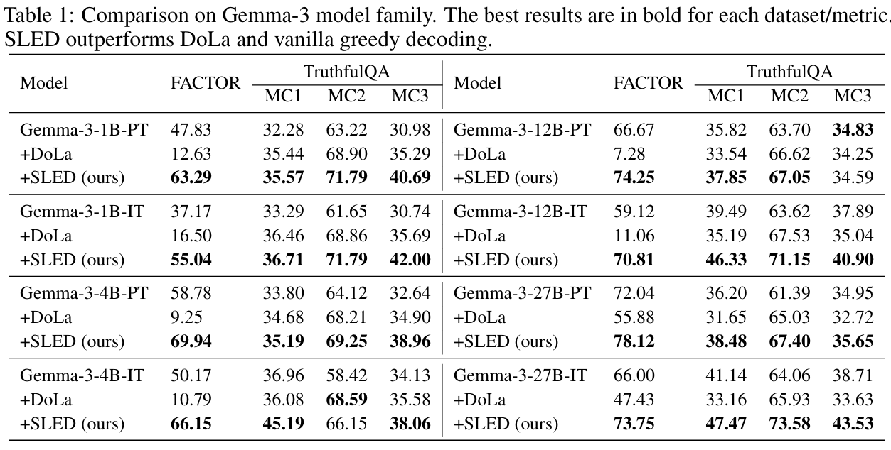 - It improves factuality on multiple-choice and long-paragraph evaluations, including TruthfulQA and FACTOR, over greedy decoding and DoLa, across Gemma-3 models from 1B to 27B parameters, with reported improvements also on Mixtral, Qwen, and gpt-oss models.