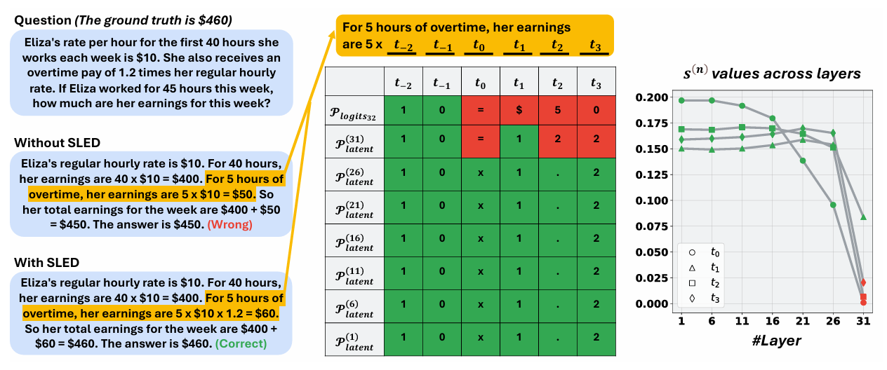 Figure 3 provides a GSM8K example that visualizes per-layer latent distributions and layer weights. When early layers overemphasize an incorrect token, SLED assigns that layer a smaller weight in the ensemble. Layers that align with the correct token receive larger weights. This alignment-aware weighting explains why aggregating across layers is more robust than choosing a single premature layer.